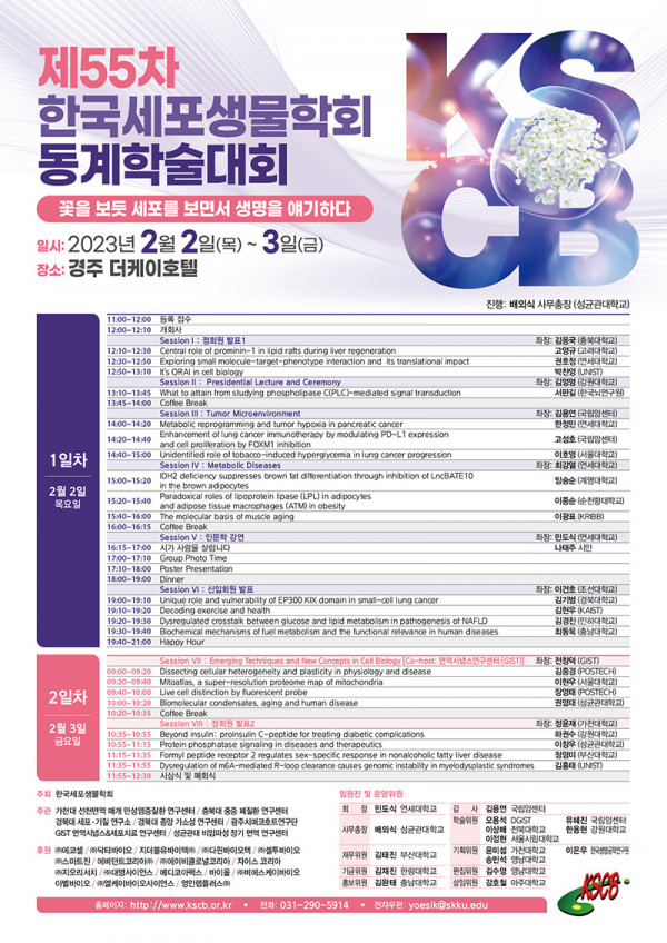 한국세포생물학회에서 제55차 동계학술대회를 2023년 2월 2일 (목)~ 3일 (금)에 경주 더케이호텔에서 개최 할 예정이오니 회원 여러분들의 일정에 참고하시기 바랍니다.