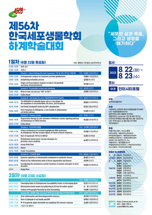 한국세포생물학회 제 56회 하계학술대회의 일정과 프로그램이 확정되어 회원여러분들에게 공지하오니 참고하시길 바랍니다.