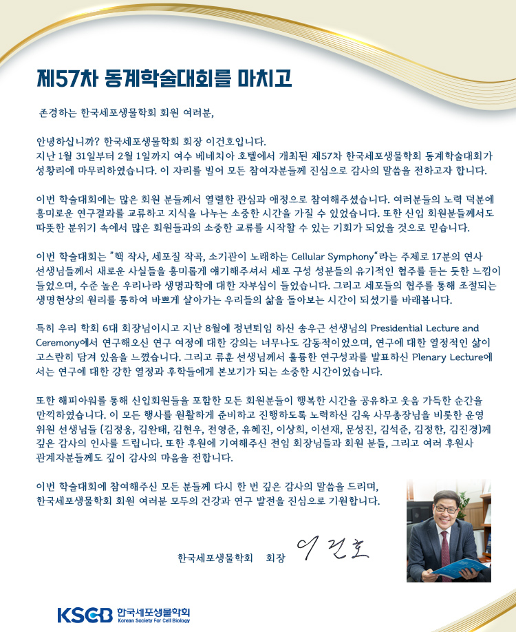 제57차 동계학술대회를 마치고 Writer 세포생물학회 View 237 Date 24-12-27 10:49 첨부파일 제57차 동계학술대회를 마치고 Prev 제58회 한국세포생물학회 하계학술대회 안내 Next 한국세포생물학회 제 57회 동계학술대회 List